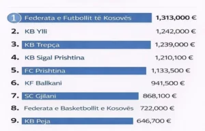 Ndër përfituesit kryesorë janë gjithashtu FC Prishtina, KF Ballkani dhe SC Gjilani, me shifra që variojnë nga 940 mijë deri në mbi 860 mijë euro.