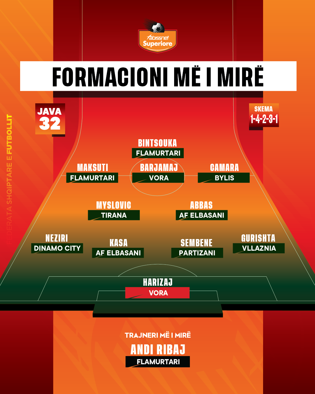 Pas përfundimit të javës së 32-të të kampionatit “Abissnet Superiore”, trajnerët e ekipeve kombëtare kanë përzgjedhur edhe 11-shen më të spikatur të kësaj jave. Në krye të saj është vendosur trajneri i Flamurtarit, Andi Ribaj, pas fitores 2-0 të vlonjatëve ndaj Egnatias.