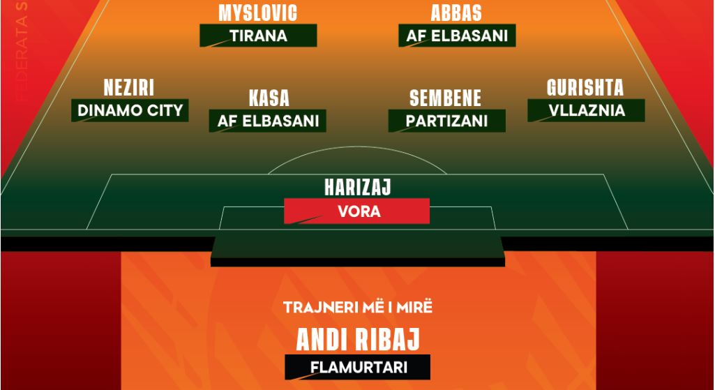 Në mesfushë janë përzgjedhur Abbas (Elbasani) dhe Patrik Myslovic (Tirana), ndërsa në repartin ofensiv spikasin Camara (Bylis), Mario Barjamaj (Vora) dhe Erald Maksuti (Flamurtari).