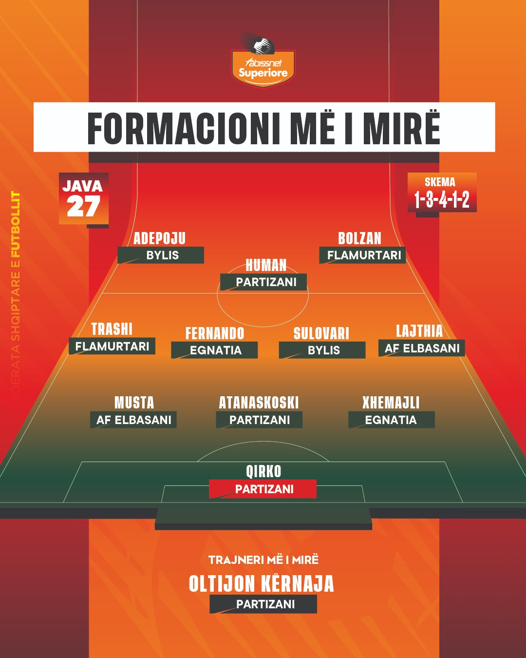 Trajneri më i mirë i javës së 27-të është përzgjedhur Oltijon Kërnaja, i cili udhëhoqi Partizanin drejt një fitoreje të rëndësishme ndaj Dinamo City.