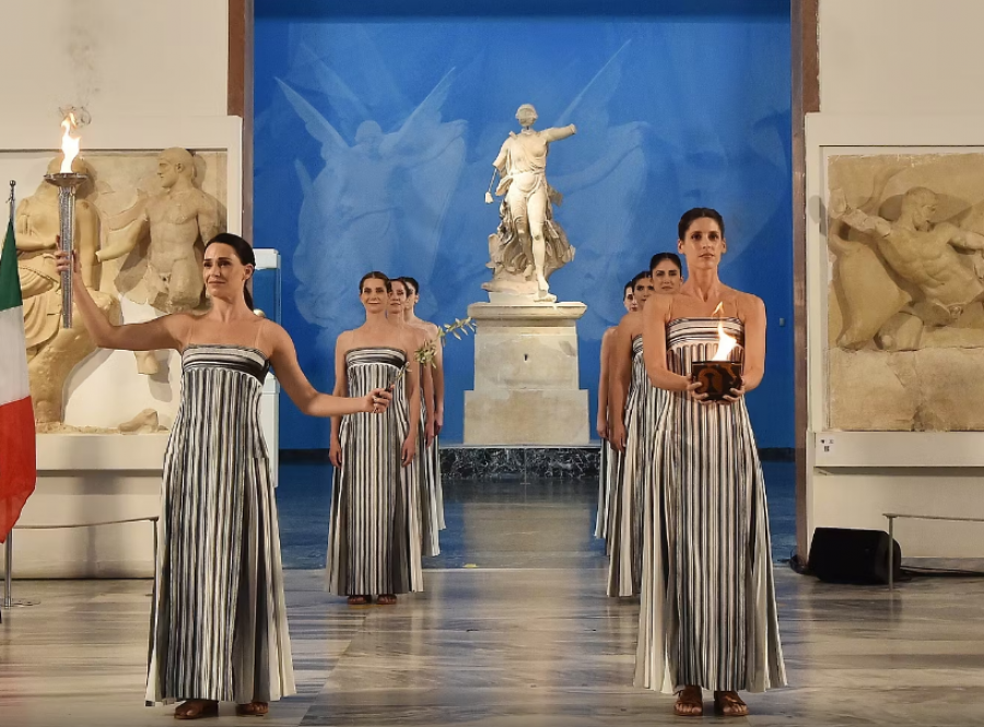 Flaka u krijua nga rrezet e diellit të reflektuara në pasqyrën parabolike, nga ana e “Priftëreshës së Madhe” Estiada, të interpretuar nga Mary Mina. Edhe pse një pjesë e ceremonisë u zhvendos brenda në Muzeun Arkeologjik për shkak të motit, ndezja u krye si gjithmonë në “Pyllin e Shenjtë”. Pishtari iu dorëzua sportistit të parë, Petros Gaidatzis, medalist i bronztë në Lojërat e Parisit 2024 në kanoe, i cili ishte i shoqëruar nga legjenda e sportit të skisë, Stefania Belmondo.