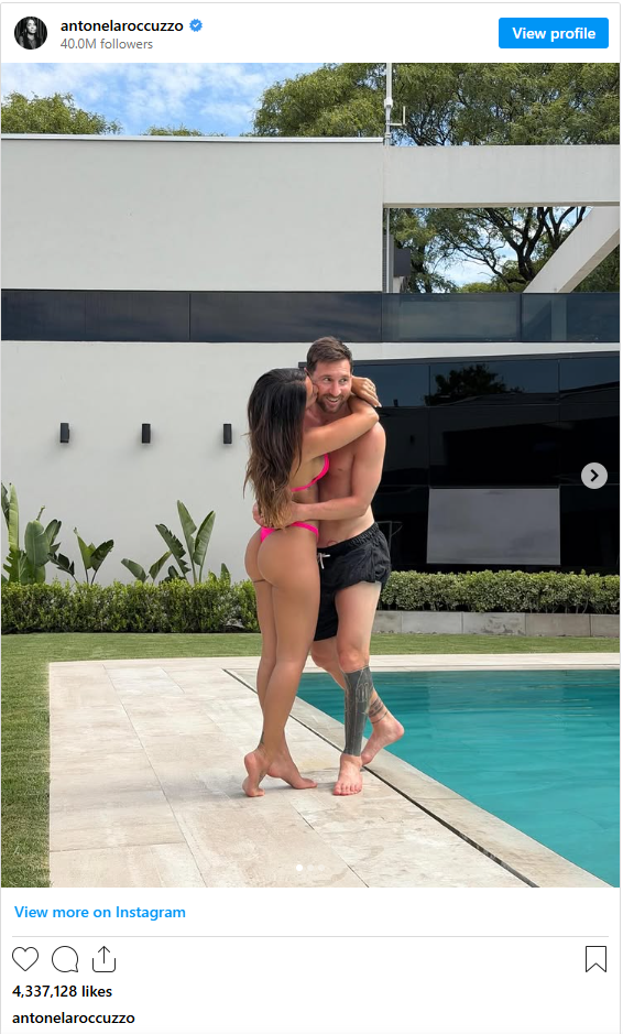 Në fundjavë, Antonela publikoi disa foto intime nga pishina e shtëpisë së tyre në Miami, ku jetojnë që nga transferimi i Messit tek Inter Miami në MLS. Në njërën prej tyre shfaqet duke puthur Messin. Postimi ka marrë mbi 4 milionë pëlqime në dy ditë dhe mijëra komente, përfshirë nga figura të njohura si Georgina Rodríguez, Paula Echevarría dhe Coral Simanovich.