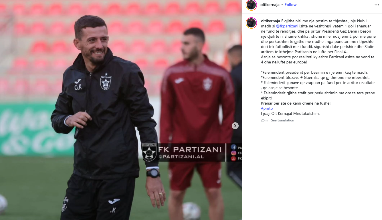 Oltijon Kërnaja ka reaguar me anë të një postimi në rrjetet sociale, pas shkarkimit nga posti i trajnerit të Partizanit ditën e sotme. Tekniku falënderon presidentin Demi për besimin e dhënë, stafin, skuadrën dhe tifozët që e kanë mbështetur.