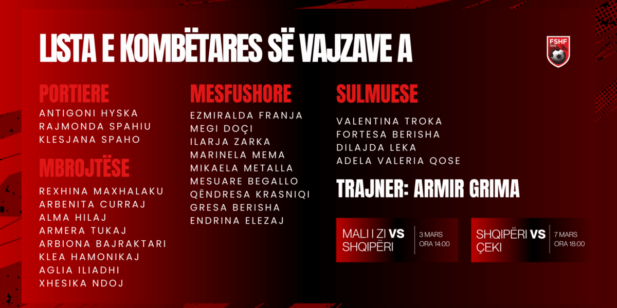Trajneri i skuadrës, Armir Grima ka ftuar 24 futbolliste për dy ndeshjet e para të muajit mars kundër Malit të Zi dhe Çekisë.