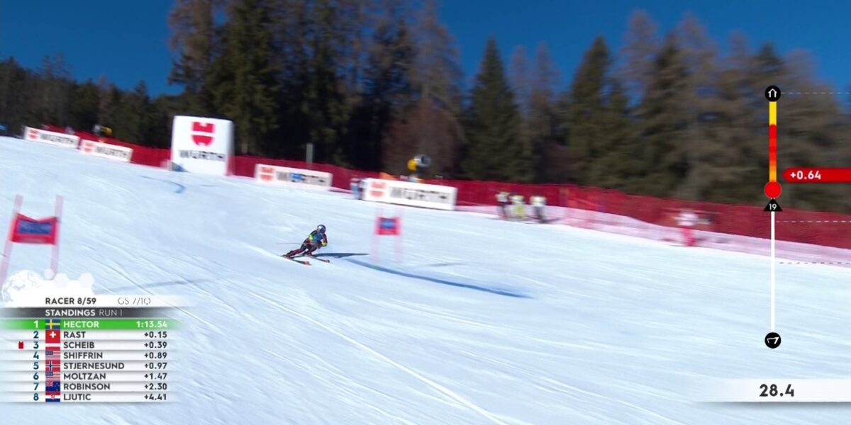 Sa i përket podit momentalisht plotësohet nga Camille Rast (1:13.69) dhe Julia Scheib (1:13.93). Të apasionuarit e skive nuk duhet që të humbin ditën e sotme zbritjen e dytë të Lara Colturi-t, e cila nis në orën 13:30 në RTSH Sport HD.