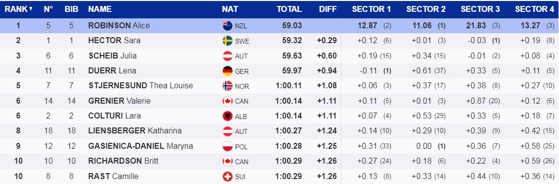 Pas pas paraqitjes së shkëlqyer në Gurgl, kurorëzuar me vendin e dytë dhe medaljen e argjendtë, skiatorja kuqezi dha kohën 1:00.14, e njëjtë me kanadezen Valerie Grenier duke ndarë vendin e 6-të, +1.11 nga vendi i parë, që mbahet nga Alice Robinson(Zelanda e Re).