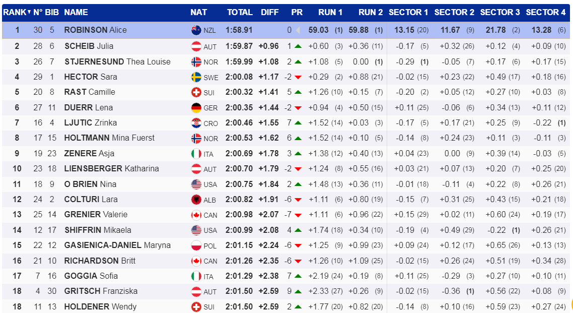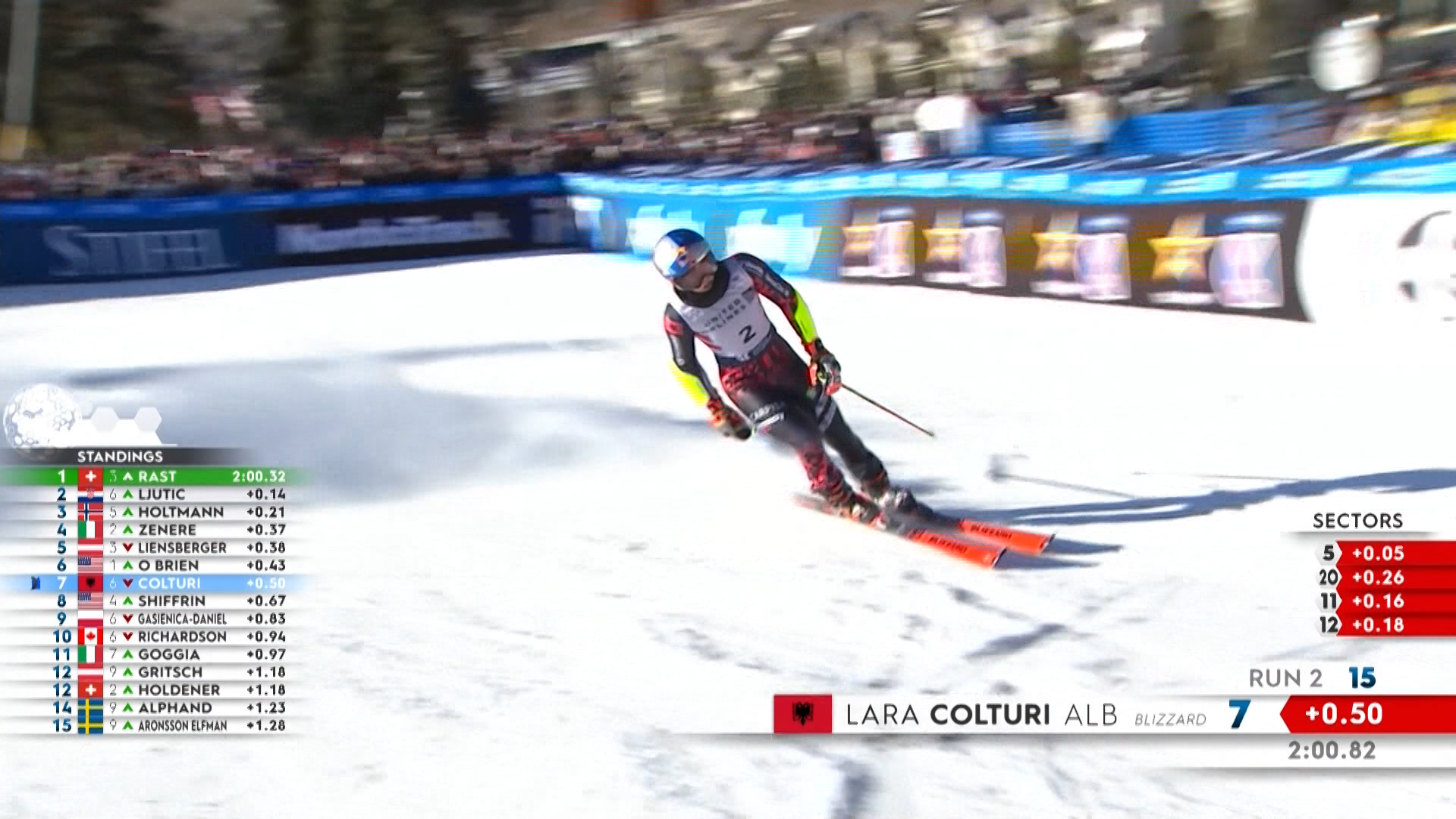 Ky rezultat për Lara Colturin vjen pas dy medaljeve të argjendta radhazi të marra në dy garat e kaluara në disiplinën slalom. Gjithsesi Lara Colturi ka lënë pas në renditje dy emra të mëdhenj të skijimit, si amerikanen Mikaela Shifrin që u pozicionuan në vendin e 14-t dhe italianen Sofia Goxhia në vendin e 17-të.
