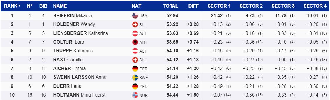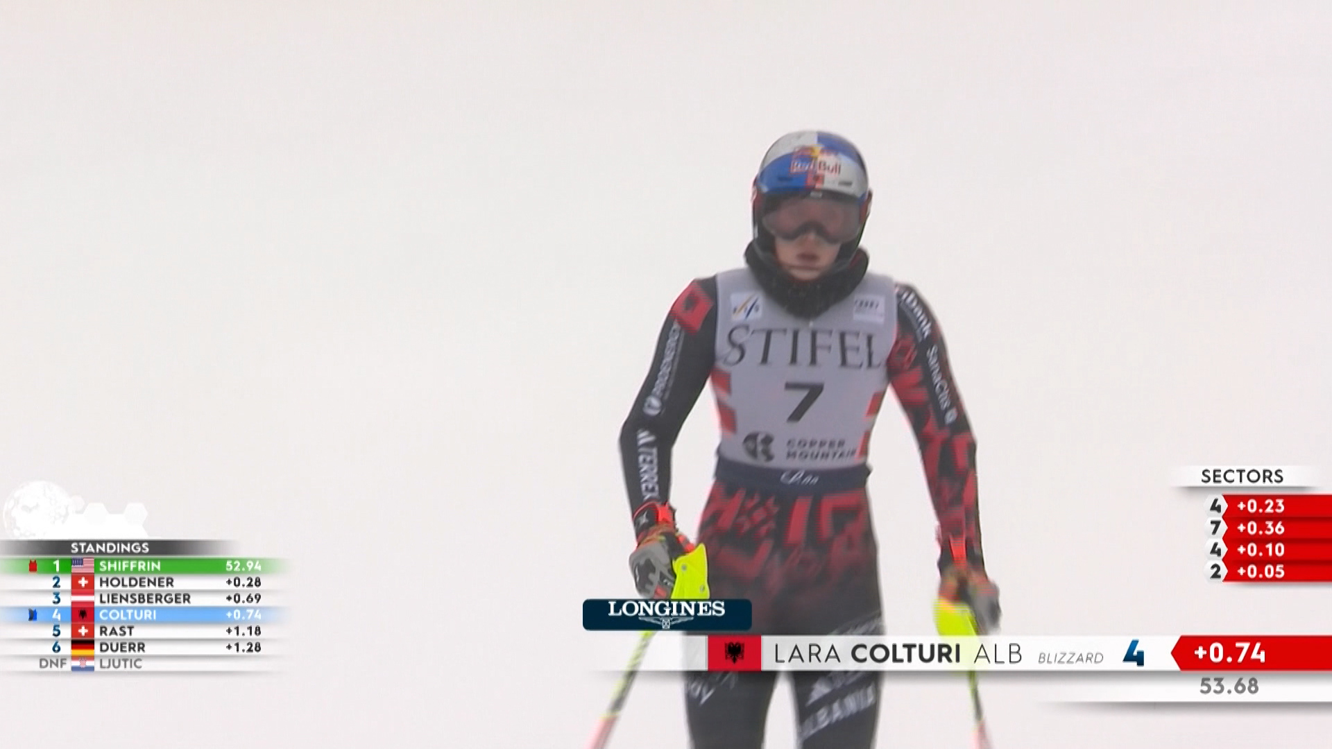 Lara Colturi vazhdon të jetë e jashtëzakonshme në garat e Kupës së Botës në ski. Në slallomin special, kjo në rrëshqitjen e parë, ka zënë vendin e katërt mes 59 konkurrentëve. Koha është fantastike për Lara Colturin, që ka fiksuar kohën 53”68 duke qenë vetëm 74 të qindtat larg Mikaela Shifrin, e cila rrëshqitjen e parë e ka mbyllur në kohën 52”94. Kujtojmë që në rrëshqitjen e dytë në Malet Kuper në Shtetet e Bashkuara të Amerikës kualifikohen 30 skiatore.