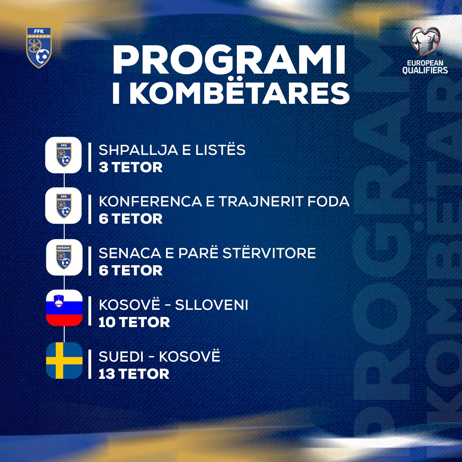 Federata e Futbollit të Kosovës (FFK) ka publikuar sot programin zyrtar të Kombëtares A në kuadër të përgatitjeve për dy ndeshjet e rëndësishme të muajit tetor, kundër Sllovenisë dhe Suedisë.