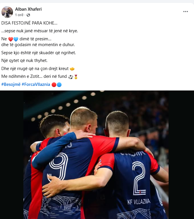 Një ditë pas humbjes 3-1 në “Elbasan Arena”, që i kushtoi Vllaznisë vendin e parë në kampionatit, presidenti i shkodranëve, Alban Xhaferri reagon me një status në rrjetet sociale.