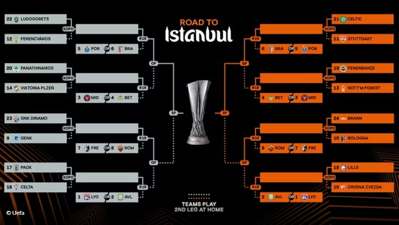 Nga çiftet e tjera Porto ndeshet me Shtutgartin, kurse Real Betis me Panathinaikosin. Lila përballet me Aston Vilën.