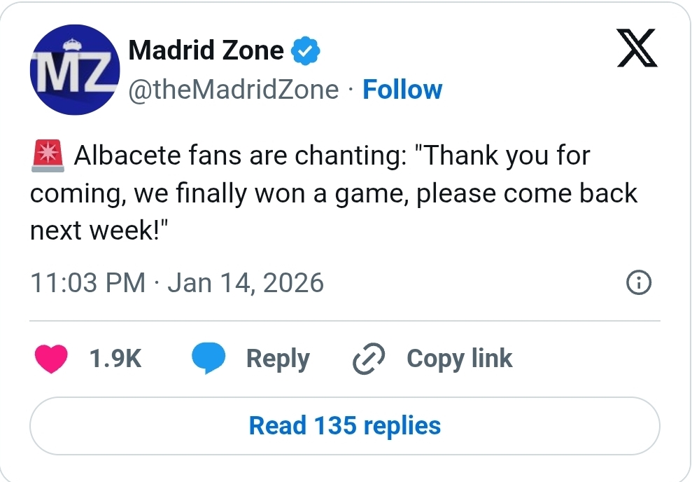 “Faleminderit që erdhët, ne me në fund fituam një ndeshje. Ju lutem ejani sërish javën tjetër”, po këndonin në kor tifozët e Albacetes pas përfundimit të ndeshjes.