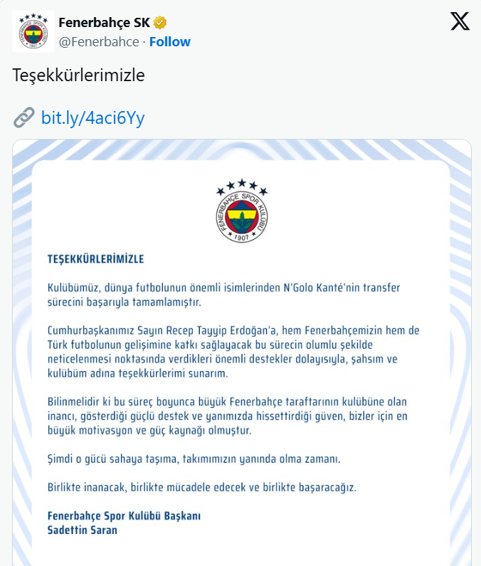 “Klubi ynë ka përfunduar me sukses transferimin e njërit prej lojtarëve më të rëndësishëm në futbollin botëror, N’Golo Kante. Falënderoj Presidentin e Republikës së Turqisë, z. Recep Tayyip Erdogan, për mbështetjen e dhënë gjatë këtij procesi, i cili do të kontribuojë në zhvillimin e Fenerbahçes dhe futbollit turk”.