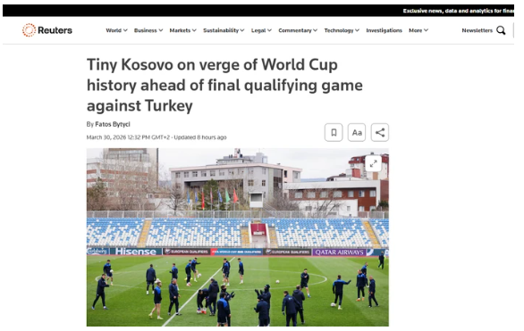 Sipas agjencisë ndërkombëtare të lajmeve Reuters, “Kosova e vogël kërkon historinë e Kupës së Botës me ndeshjen vendimtare kundër Turqisë”.