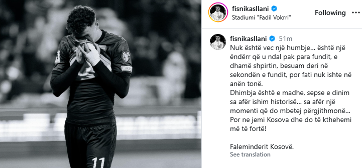 “Nuk është veç një humbje… është një ëndërr që u ndal pak para fundit. E dhamë shpirtin, besuam deri në sekondën e fundit, por fati nuk ishte në anën tonë”, ka shkruar ai.