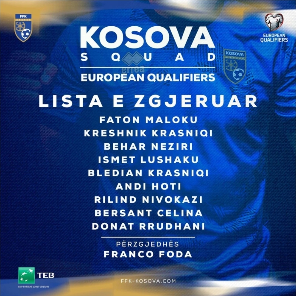 Përzgjedhësi i Kombëtares së Kosovës, Franco Foda, ka bërë publike listën e futbollistëve të ftuar për dy ndeshjet kualifikuese të Kampionatit Botëror 2026 që zhvillohen në muajin tetor, kundër Sllovenisë dhe Suedisë.