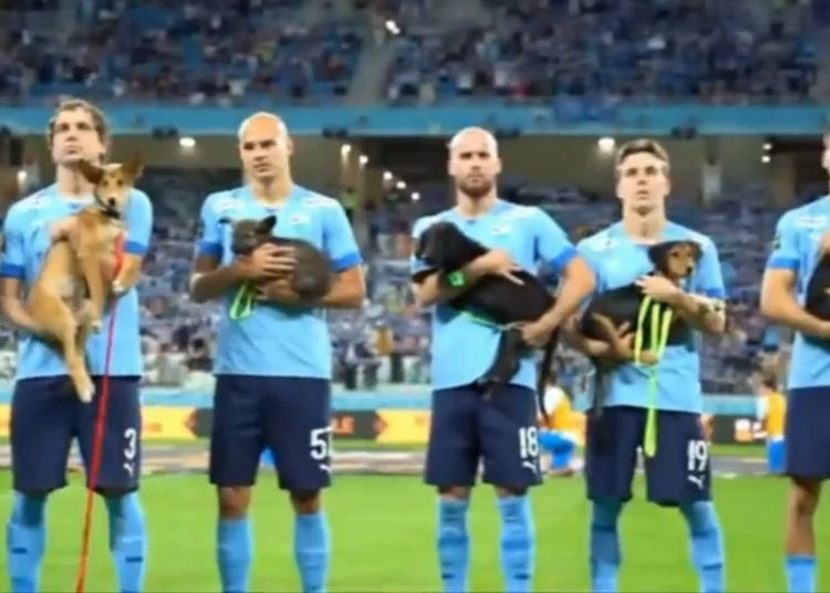 Futbollistët habitën fansat e tyre e fundjave kur dolën në fushë duke mbajtur secili në krahë një qen nga streha vendase, për të mbështetur kauzën e adoptimit të kafshëve.