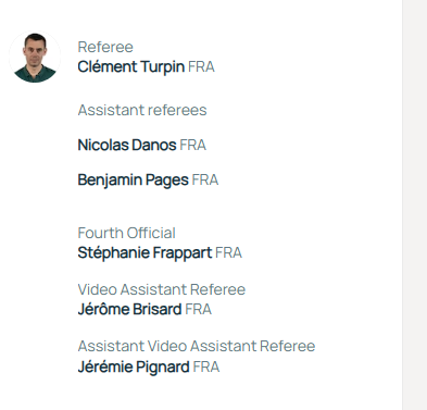 Clement Turpin do të jetë kresori, me ndihmësitë e tij: Nicolas Danos dhe Benjamin Pages.