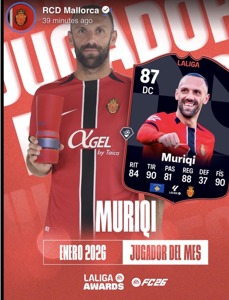 Muriqi është bëtë kosovari i parë që shpallet “Lojtari i Muajit” në La Liga, shkruan IndeksOnline.