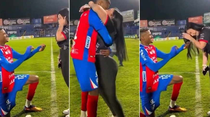 Derrikson Quiros chiede la mano della sua bella dopo la partita di domenica vinta 4-2 dal suo Xelajù sul Marquense.