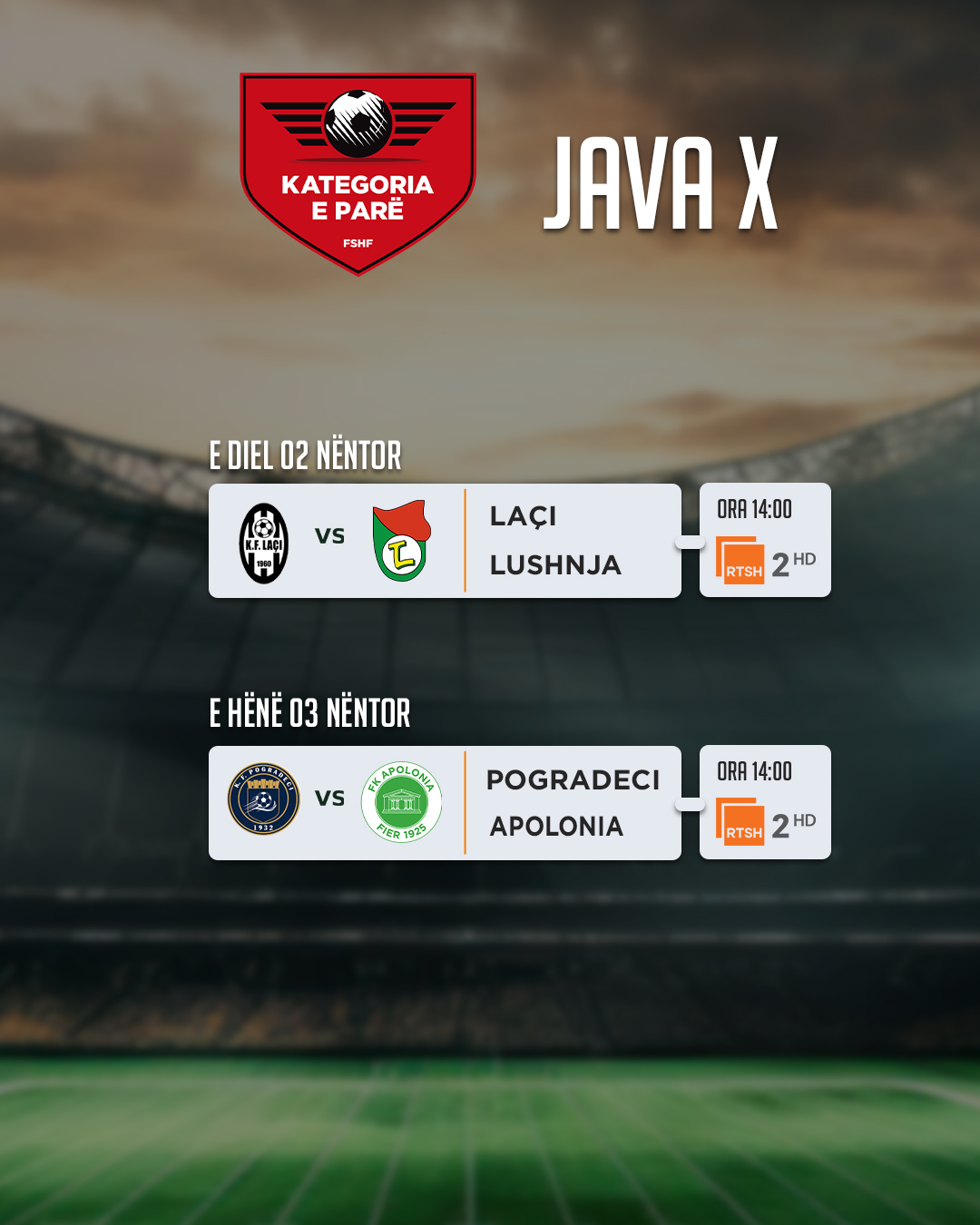 Të dielën dhe të hënën do të zhvillohen ndeshjet e javës së dhjetë të Kategorisë së Parë. Në Laç, bardhezinjtë vendas do të presin Lushnjën, ndeshje që do të transmetohet direkt në ekranin e RTSH 2. Laçi mban vendin e dytë, me 17 pikë, Lushnja të nëntin, me nëntë pikë.