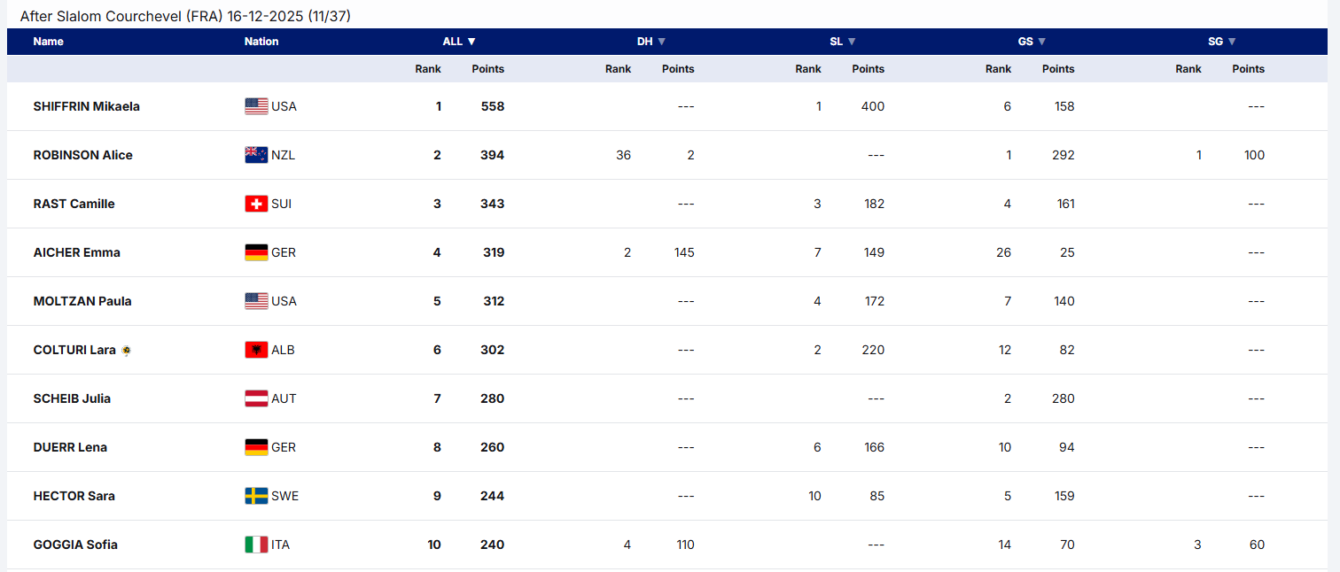 Renditjen e përgjithshme e kryeson Mikaela Shifrin, fituesja e garës së fundit në Courchevel, me 558 pikë, e ndjekur nga Alice Robinson me 394.