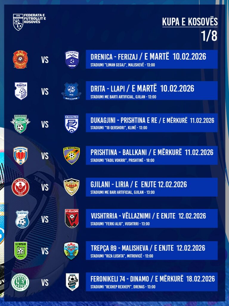 Ndërkaq, tri ndeshje të tjera të kësaj faze zhvillohen të enjten: Gjilani – Liria, Vushtrria – Vëllaznimi dhe Trepç ’89 – Malisheva. Takimi Feronikeli ’74 – Dinamo është paraparë të luhet të mërkurën e ardhshme, më 18 shkurt.