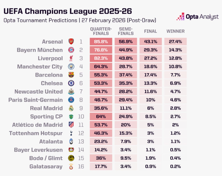 Përpara shortit, Arsenali ishte favorit sipas superkompjuterit Opta për të shkuar deri në fund dhe për të fituar Ligën e Kampionëve për herë të parë në histori.