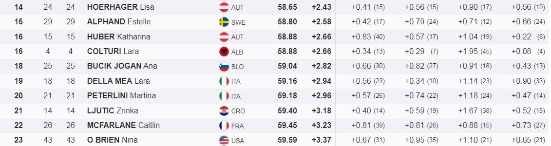 Lara Colturi është renditur e 16-ta me kohën 58.88 në lëshimin e parë në garën e Flachau(Austri), që po vjen për shikuesit në ekranin e RTSH.