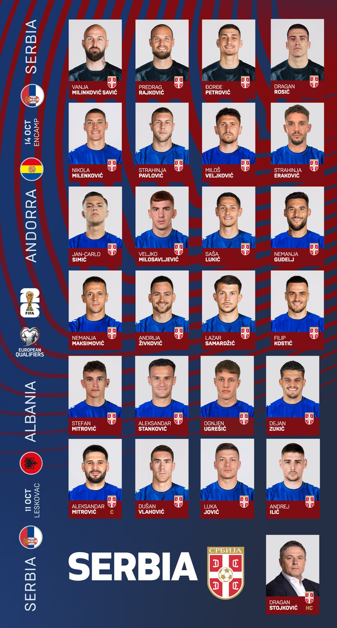 Trajneri i ekipit kombëtar serb, Dragan Stojkoviç, ka publikuar listën e lojtarëve të thirrur për ndeshjet e planifikuara për 11 tetor kundër Shqipërisë dhe 14 tetor kundër Andorrës.