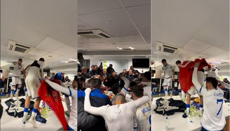 Lojtarët festojnë në zhveshtore duke kënduar këngën: Unë jam shqipe nga Kosova