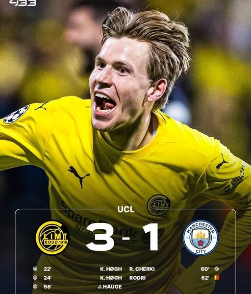 Manchester City ka pësuar humbje befasuese në udhëtim nga ekipi norvegjez Bodo Glimt me rezultat 3:1 në kuadër të xhiros së 7-të të fazës së ligës në Ligën e Kampionëve.