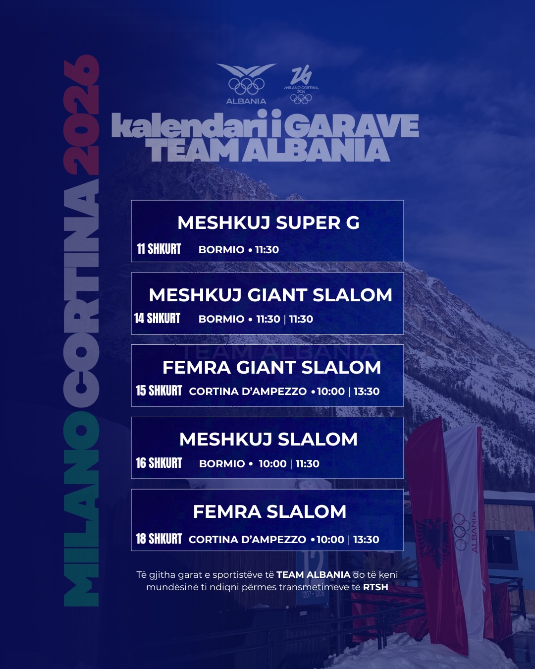 Sot në orën 20:00 do të zhvillohet Ceremonia e Hapjes e Lojërave Olimpike Dimërore, Milano Cortina 2026, event që do të transmetohet drejtpërdrejt dhe ekskluzivisht në rrjetin e Radio Televizionit Shqiptar.