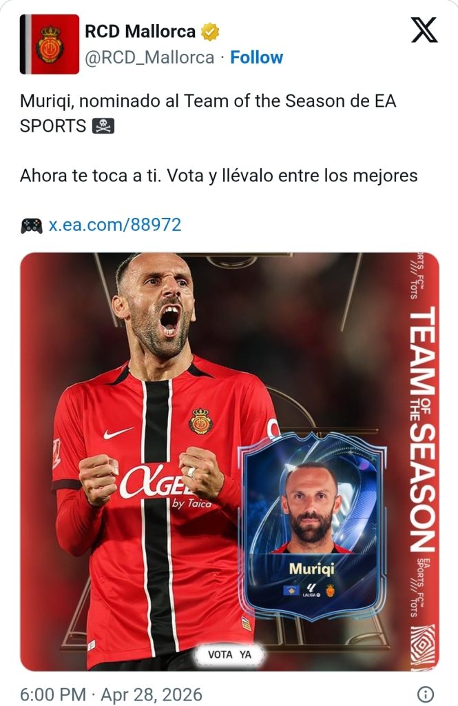 “Muriqi, i nominuar për ekipin më të mirë të sezonit EA SPORTS”, thuhet në njoftimin e klubit spanjoll, duke vlerësuar kështu paraqitjet e shkëlqyera të yllit të tyre në këtë sezon.