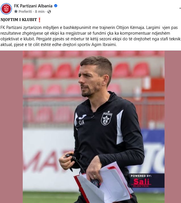 FK Partizani zyrtarizon mbylljen e bashkëpunimit me trajnerin Oltijon Kërnaja. Largimi vjen pas rezultateve zhgënjyese që ekipi ka rregjistruar së fundmi çka ka kompromentuar ndjeshëm objektivat e klubit. Përgjatë pjesës së mbetur të këtij sezoni ekipi do të drejtohet nga stafi teknik aktual, pjesë e të cilit është edhe drejtori sportiv Agim Ibraimi.