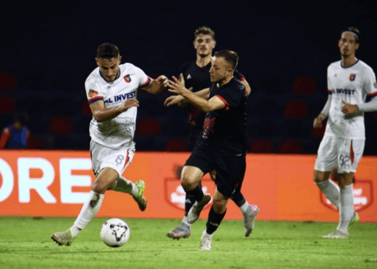 Alessandro Albanese (Egnatia) dhe Dejvi Bregu (Dinamo City) mbështesin sulmuesin e AF Elbasanit, Blaise Tsague, në majën e sulmit.
