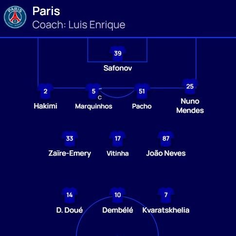 PSG: Safonov, Hakimi, Marquinhos, Pacho, Mendy, Neves, Vitinha, Zaïre-Emery, Doué, Dembélé, Kvaratskhelia