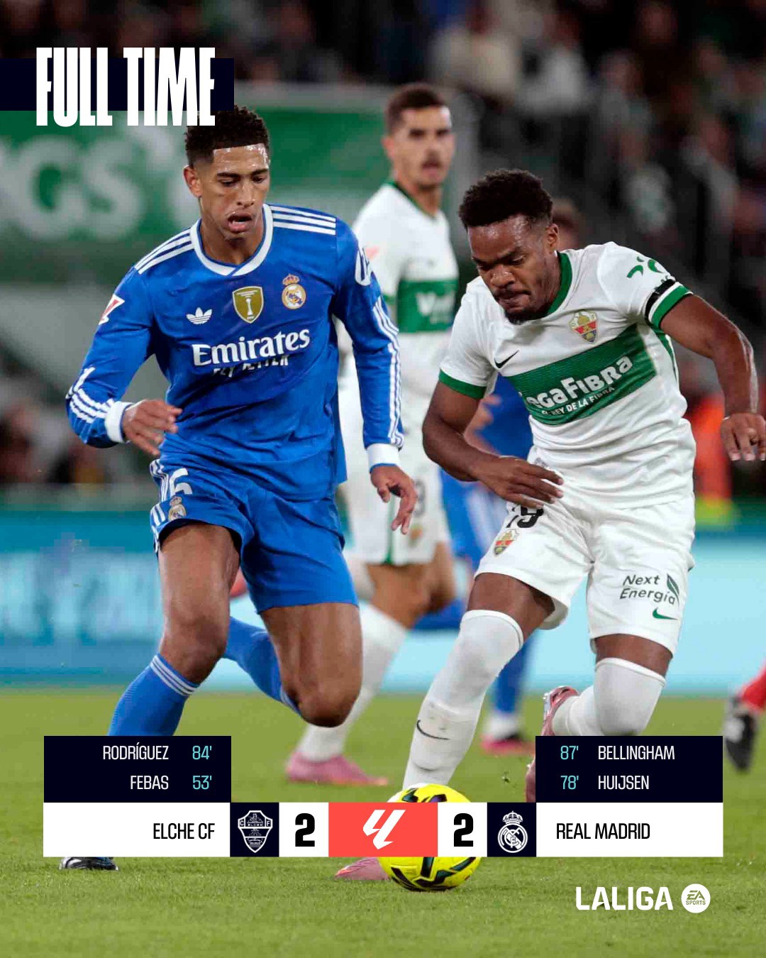 Reali ndalet përsëri, barazim 2-2 në fushën e Elche. Ky është barazimi i dytë i madrilenëve, pas atij 0-0 në fushën e Vallecano, duke i dhënë mundësinë Barcelonës të afrohet në klasifikim, distanca është reduktuar në një pikë.