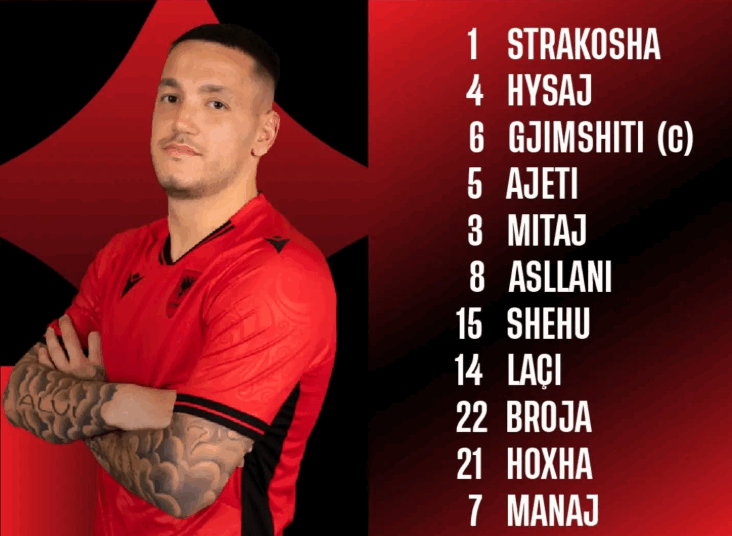 SHQIPËRIA: Strakosha, Gjimshiti, Ajeti, Hysaj, Mitaj, Shehu, Laçi, Asllani, Hoxha, Broja, Manaj.