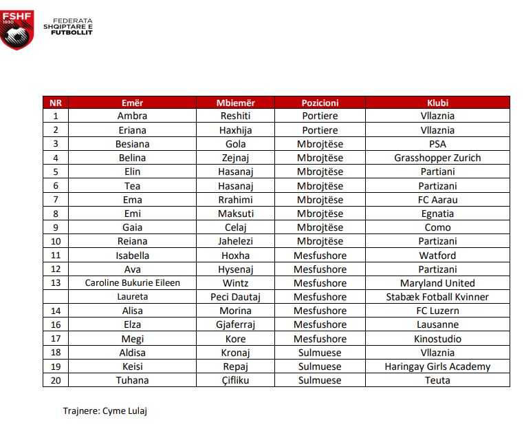 Për këtë aktivitet, trajnerja Lulaj ka përzgjedhur 20 futbolliste, një pjesë e të cilave luajnë në ekipet e moshave në kampionatin tonë ndërsa pjesa tjetër angazhohen jashtë vendit.