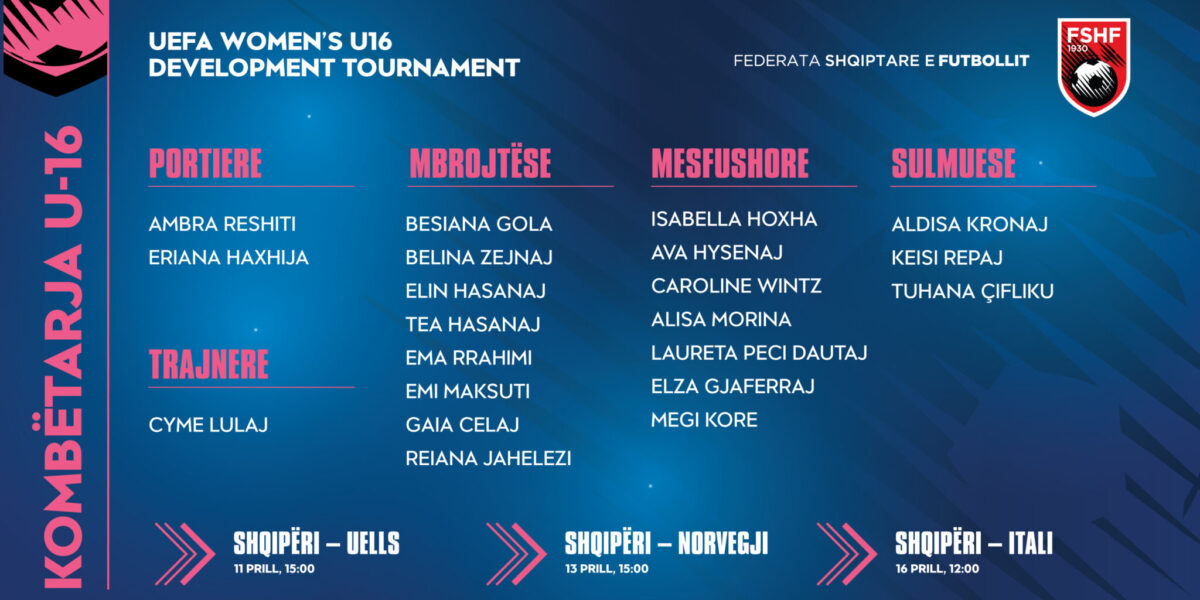 Skuadra e drejtuar nga trajnerja Cyme Lulaj do të marrë pjesë në turneun “UEFA Development” për këtë grupmoshë, ku do të përballet me Italinë, Norvegjinë dhe Uellsin. Ky turne ka si objektiv kryesor evidentimin dhe zhvillimin e talenteve të reja, duke u ofruar lojtareve të reja eksperiencë ndërkombëtare.