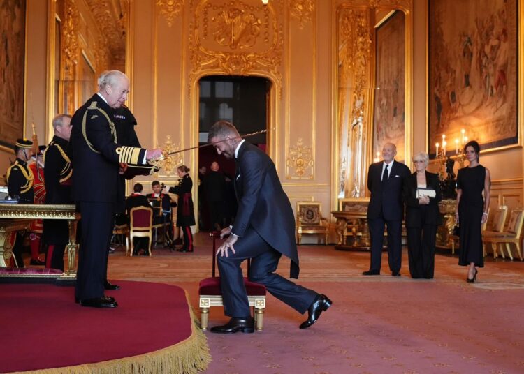 Beckham mori titullin e kalorësit nga Mbreti Charles III dhe në këtë rast veshi një kostum elegant të dizajnuar nga bashkëshortja e tij, Victoria Beckham, stiliste e njohur dhe ish-anëtare e grupit “Spice Girls”.