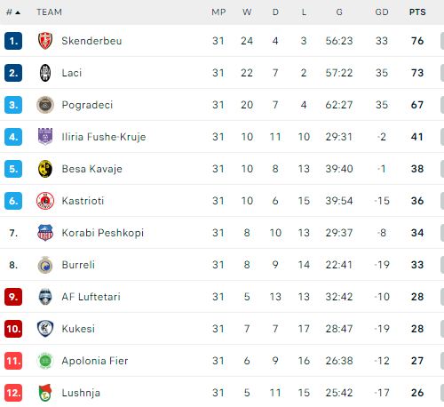 Edhe pse Pogradeci ndodhet në vendin e tretë me 67 pikë, diferenca prej 6 pikësh me Laçin nuk mjafton për të ndryshuar renditjen, pasi skuadra kurbinase ka avantazhin në përballjet direkte mes dy ekipeve.