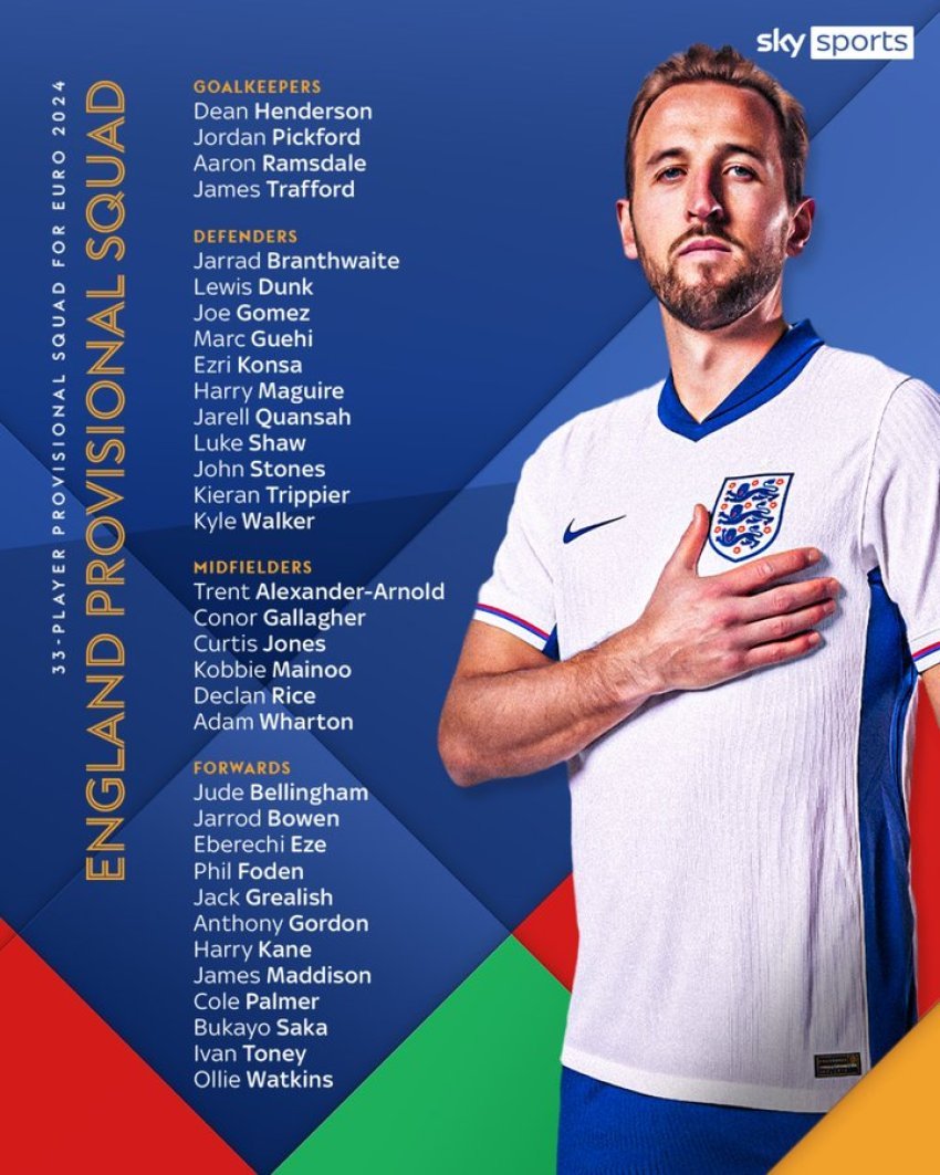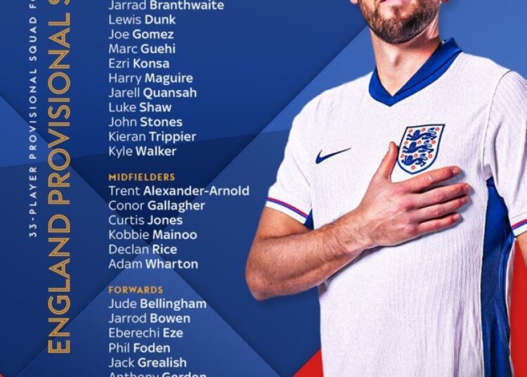 Trajneri i Anglisë, Gareth Southgate, ka publikuar listën provizore të lojtarëve të ftuar për Kampionatin Evropian që do të mbahet në Gjermani nga 14 qershori deri më 14 korrik.