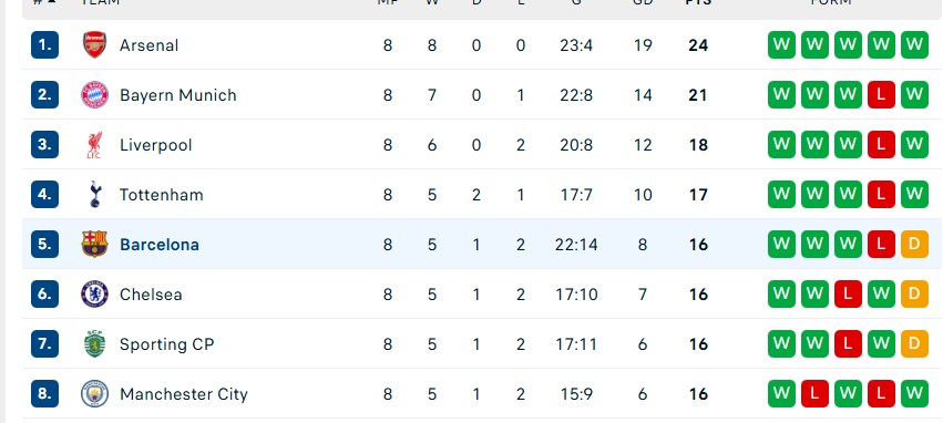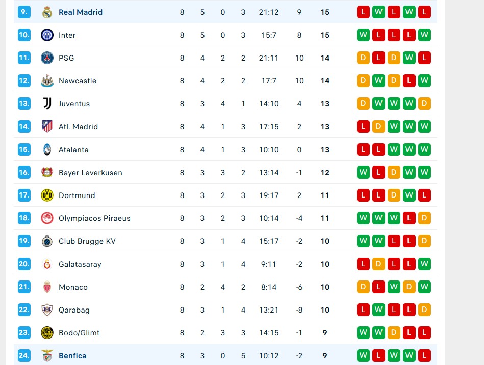 Tabloja e plotë e Champions League: 8 ekipet e para, 16 ekipet e play-offit dhe 12 ekipet e skualifikuara