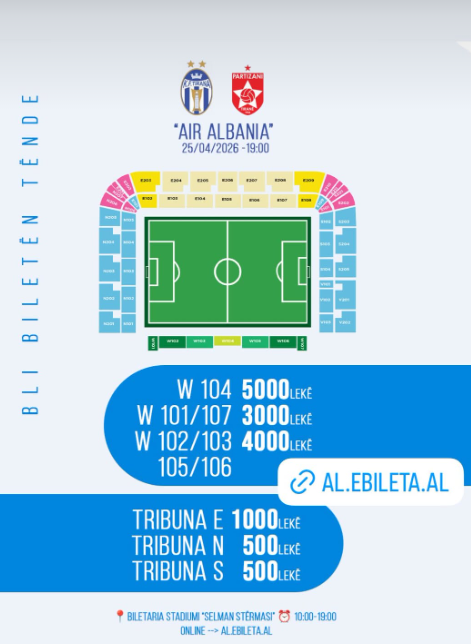 Klubi bardheblu publikon çmimet e biletave për sfidën e së shtunës kundër rivalëve të Partizanit në kampionat. Një vend në tribunën VIP kushton 5 000 lekë, ndërsa bileta më e lirë kushton 500 lekë. Biletat mund të blihen te pika e shitjes në stadiumin “Selman Stermasi” dhe online.