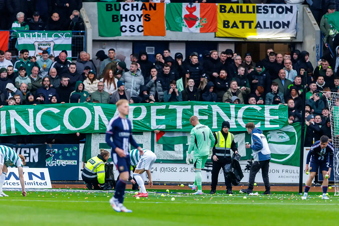 Ndeshja e Celtic në fushën e Dundee të dielën u ndërpre shpejt kur tifozët miq hodhën topa tenisi dhe portokalle në fushë pas fillimit të ndeshjes në shenjë proteste kundër menaxhimit të klubit. Lojtarët dhe stafi i të dyja ekipeve ndihmuan në pastrimin e fushës përpara se ndeshja e Premier League Skoceze të rifillonte në Dens Park, me kampionët në fuqi Celtic që humbën me rezultatin 2-0.