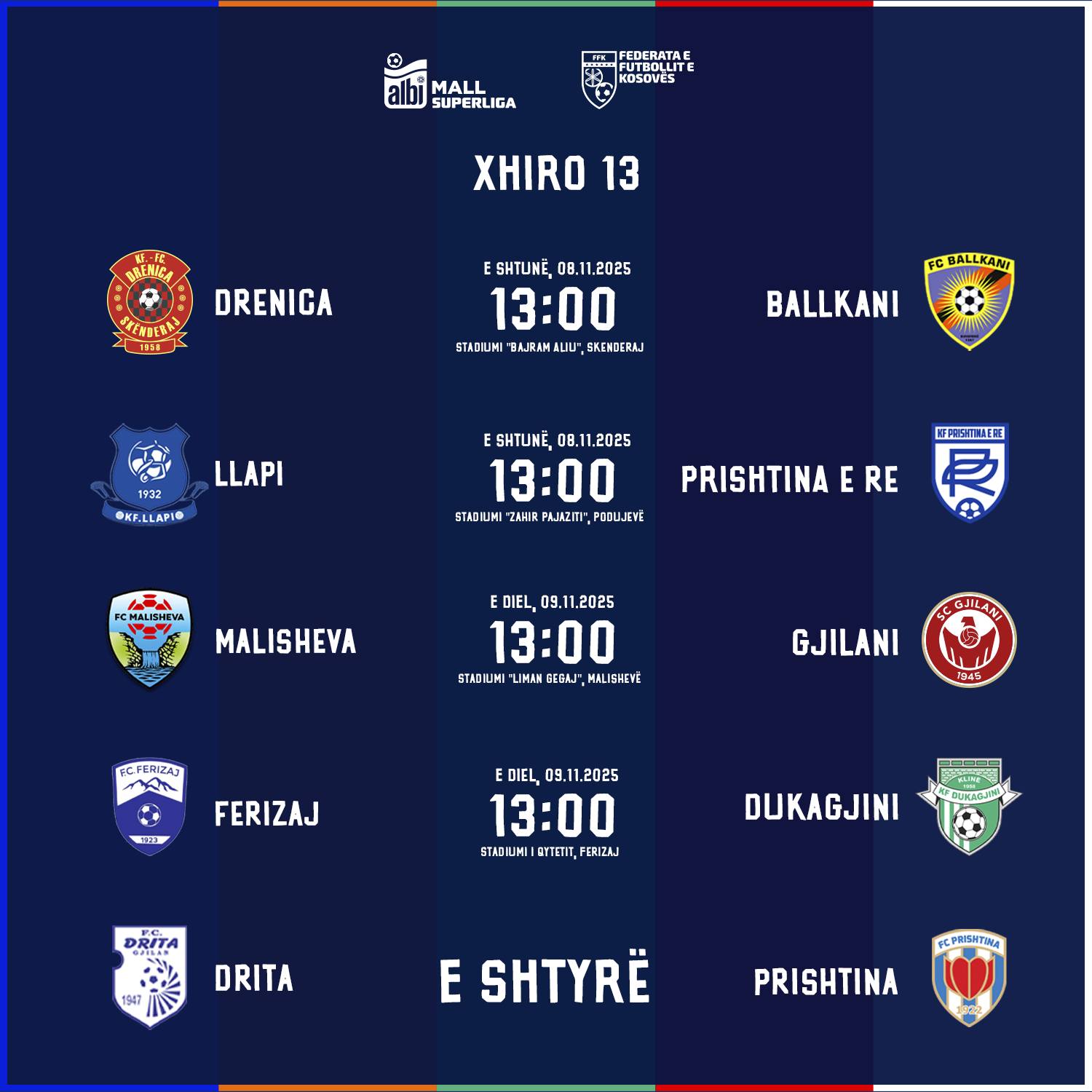 Federata e Futbollit të Kosovës ka publikuar orarin për javën e 13-të në Superligë.