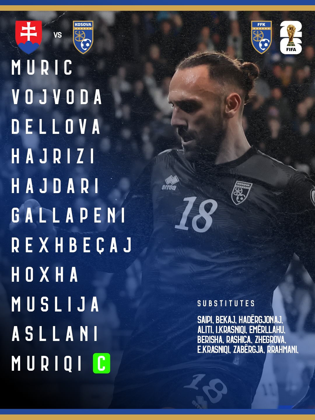 Kosova: Muric, Dellova, Hajrizi, Hajdari; Vojvoda, Hoxha, Rexhbecaj, Muslija, Gallapeni; Asllani, Muriqi;